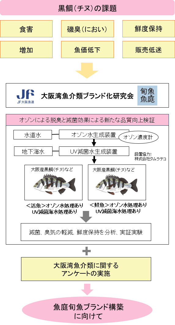 魚庭旬魚ブランド化 オゾンによる脱臭と 減菌効果による新たな品質向上実証検証 黒鯛による魚介類など食害が増加。養分の多い大阪湾では磯臭の課題。 現代の暮らしの要望に合わせた鮮度処理など実施管理が望まれる。 大阪府漁連 オゾン鮮度脱臭処理実証実験実施中